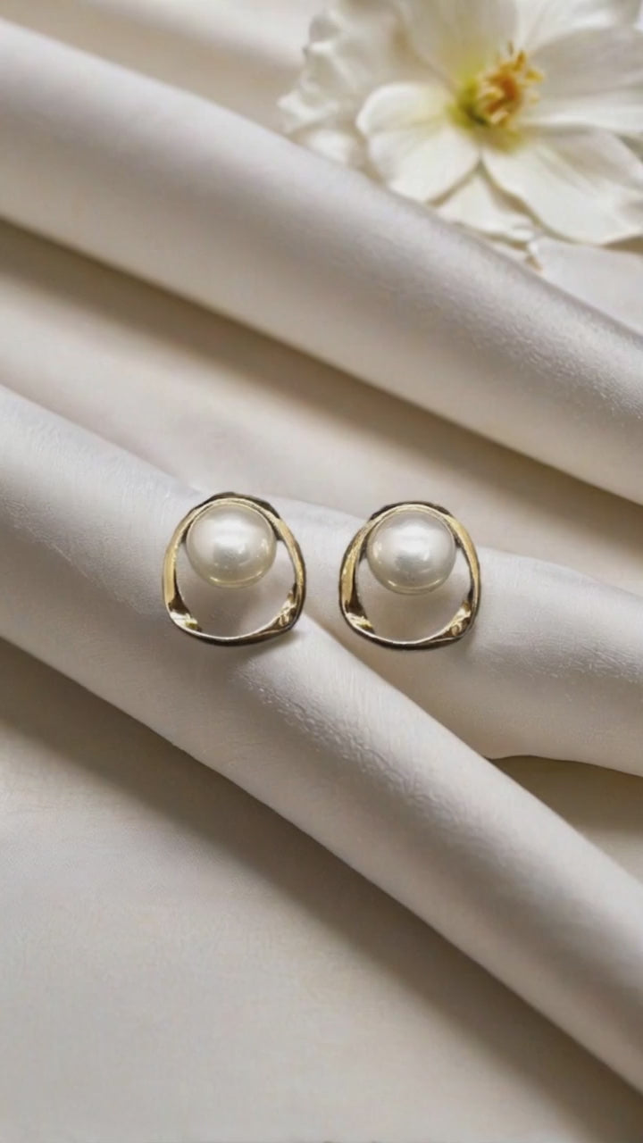 Elevate your everyday style with the timeless elegance of the 14k gold plated - Halo Pearl Studs. These pearl stud earrings feature luminous faux pearls set within fluid, open gold-tone halos—blending classic charm with modern design.